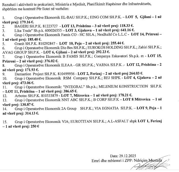 Plot 91 grupe operatorësh ekonomikë hynë në garë për kontratat milionëshe që përfshijnë mirëmbajtjen verore dhe dimërore të rrjetit rrugor në gjithë territorin e Kosovës. Pas një procesi vlerësimi, 15 grupe operatorësh janë shpallur fitues dhe do të menaxhojnë segmentet përkatëse të rrugëve në nivel vendi.