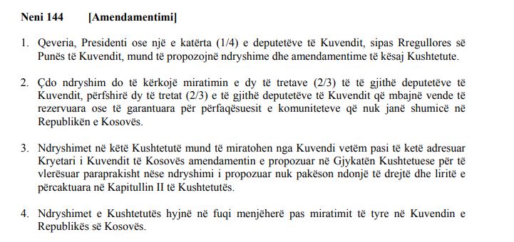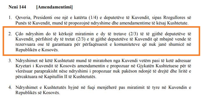 ‘’Duhët të bëhet patjetër votimi i ndryshim/plotësimeve të shumicës së shumicës, të 120-të deputetëve pra 80 dhe të shumicës së pakicave që përfshinë edhe komunitetin serb dhe komunitet tjera jo shqiptare. Pra 20 vende që ata i kanë të rezervuara, pra 10 komuniteti serb dhe 10 komunitetet tjera duhet të jenë 2/3 e tyre, pra duhet të jenë 2/3 e 20 deputetëve.Nëse ata votojnë atëherë ndryshimet kanë valitited’’ thotë Baraliu për Indeksonline.