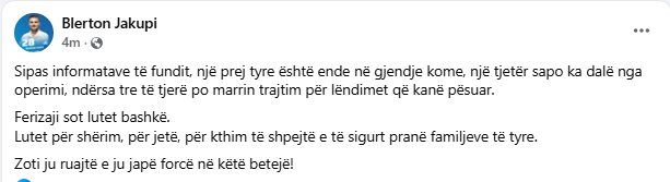 Jakupi, përmes një postimi tjetër të bërë pak më parë, ka thënë edhe se sipas informatave që ka ai, njëri nga të lënduarit është në gjendje kome.