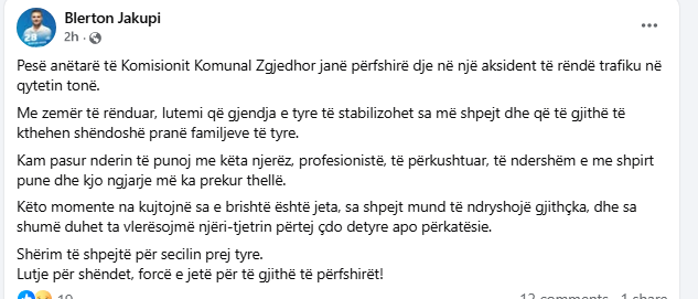 ‘‘Pesë anëtarë të Komisionit Komunal Zgjedhor janë përfshirë dje në një aksident të rëndë trafiku në qytetin tonë. Me zemër të rënduar, lutemi që gjendja e tyre të stabilizohet sa më shpejt dhe që të gjithë të kthehen shëndoshë pranë familjeve të tyre. Kam pasur nderin të punoj me këta njerëz, profesionistë, të përkushtuar, të ndershëm e me shpirt pune dhe kjo ngjarje më ka prekur thellë. Këto momente na kujtojnë sa e brishtë është jeta, sa shpejt mund të ndryshojë gjithçka, dhe sa shumë duhet ta vlerësojmë njëri-tjetrin përtej çdo detyre apo përkatësie. Shërim të shpejtë për secilin prej tyre. Lutje për shëndet, forcë e jetë për të gjithë të përfshirët!’’, ka thënë ai përmes një postimi në Facebook.