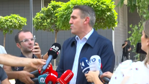 Deputeti Glauk Konjufca ka folur para gazetarëve në oborrin e Kuvendit të Kosovës derisa është