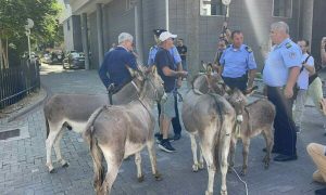 Protesta e avokatit Arianit Koci, i çon katër gomarë afër oborrit të Kuvendit