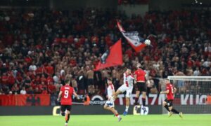Flamuri kuq e zi me kokë poshtë dhe harta e Kosovës nën flamurin serb/ Tifozët shqiptarë përleshen me çekët në tribunë