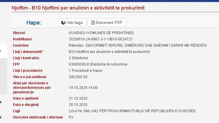 Fillimisht, ishte shpallur fituesi i tenderit për dekorimet verore, dimërore dhe shënimin e datave me rëndësi. Megjithatë, sot Zyra e Prokurimit e Komunës ka marrë vendim për anulimin e këtij tenderi. Vlera totale e tij ishte 240 mijë euro.