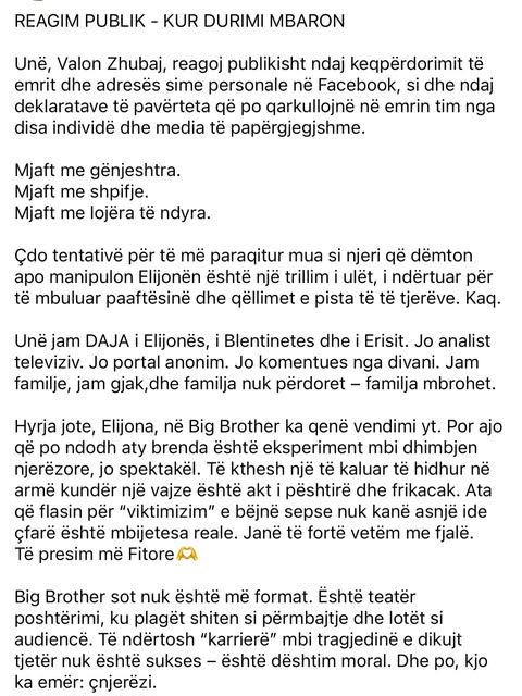 Daja i Elijonës ka shpërthyer me një reagim të fortë publik drejtuar produksionit të “Big Brother”, duke kundërshtuar kategorikisht rrëfimin e mbesës së tij brenda shtëpisë më të famshme në vend. Ai deklaron se emri dhe adresa e tij personale po keqpërdoren në rrjetet sociale dhe se po përballet me fyerje, kërcënime dhe shpifje nga persona të panjohur.