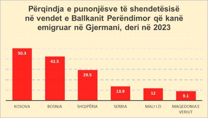Një studim i fundit në Gjermani mbi emigrimin në vendet e Ballkanit Perëndimor evidentoi se afërsisht 50% stafit shëndetësor nga Kosova kishin emigruar në Gjermani deri në vitin 2023.