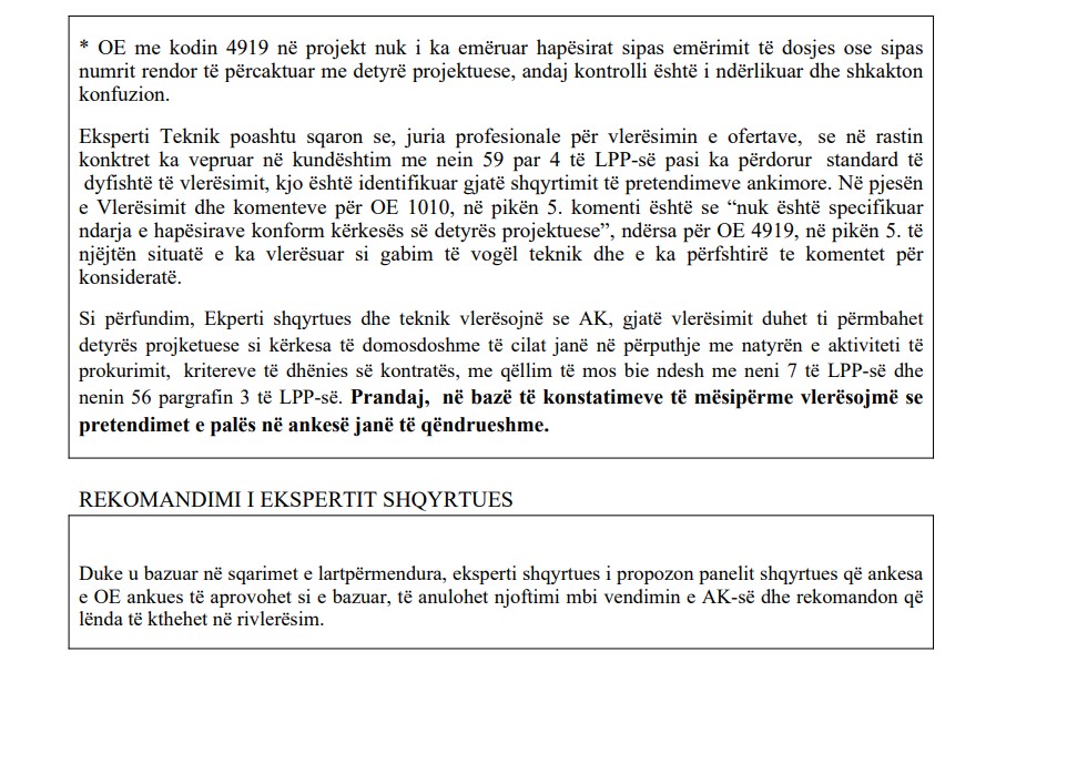 “Si përfundim, Ekperti shqyrtues dhe teknik vlerësojnë se AK, gjatë vlerësimit duhet ti përmbahet detyrës projketuese si kërkesa të domosdoshme të cilat janë në përputhje me natyrën e aktiviteti të prokurimit, kritereve të dhënies së kontratës, me qëllim të mos bie ndesh me neni 7 të LPP-së dhe nenin 56 pargrafin 3 të LPP-së. Prandaj, në bazë të konstatimeve të mësipërme vlerësojmë se pretendimet e palës në ankesë janë të qëndrueshme. Duke u bazuar në sqarimet e lartpërmendura, eksperti shqyrtues i propozon panelit shqyrtues që ankesa e OE ankues të aprovohet si e bazuar, të anulohet njoftimi mbi vendimin e AK-së dhe rekomandon që lënda të kthehet në rivlerësim”, thuhet në vendimin e raportit të ekspertit për këtë tender, i cili kap një vlerë prej 100 mijë eurove.