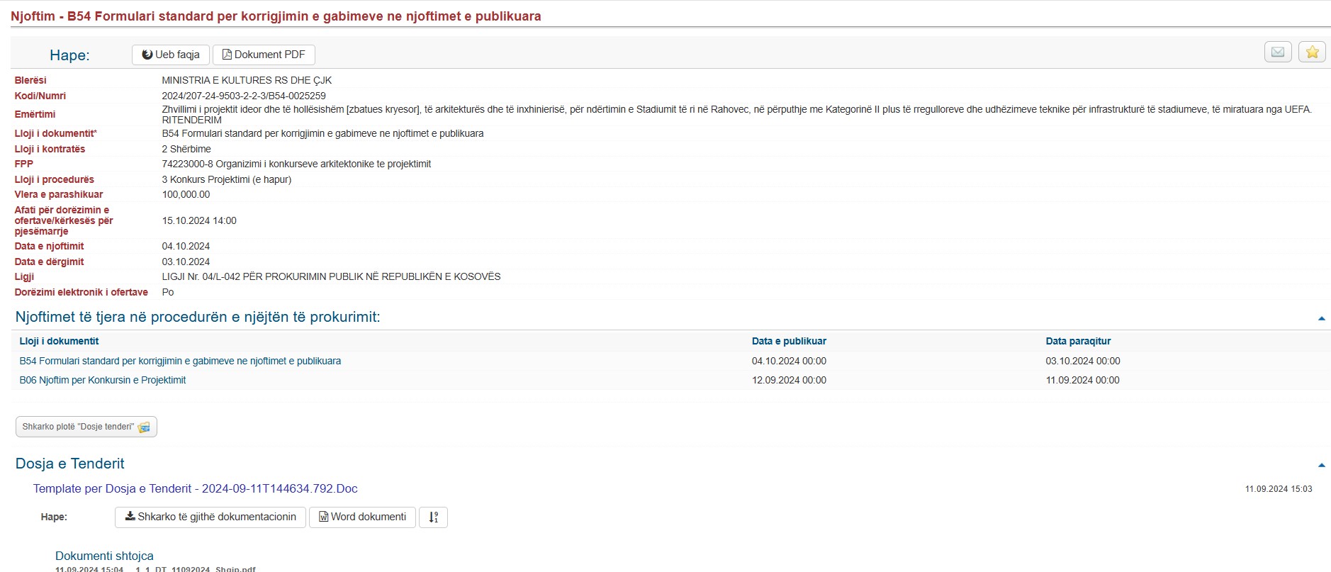 Qysh më 11 shtator 2024, ministria publikoi njoftimin për kontratë, Zhvillimi i projektit ideor dhe të hollësishëm [zbatues kryesor], të arkitekturës dhe të inxhinierisë, për ndërtimin e Stadiumit të ri në Rahovec, në përputhje me Kategorinë II plus të rregulloreve dhe udhëzimeve teknike për infrastrukturë të stadiumeve, të miratuara nga UEFA. RITENDERIM”, i cili u korrigjua më 3 tetor 2024, duke përfshirë dosjen e tenderit me ndryshimet e bëra. Vlen të theksohet se ndaj këtyre ndryshimeve nuk kishte asnjë ankesë nga operatorët ekonomikë (OE). Procesi i hapjes së ofertave ende nuk është përfunduar, por janë pranuar pesë oferta të koduara.