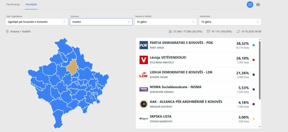 Bazuar në rezultatet tanimë finale del se PDK-ja mori 38.32% të votave për asamble, kurse Vetëvendosje 26.10%.