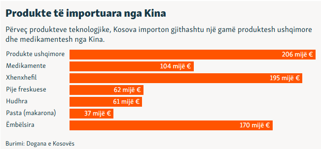 Në anën tjetër, eksportet e Kosovës drejt Kinës mbeten pothuajse simbolike: më pak se një milion euro në vit – çka e thellon ndjeshëm deficitin tregtar dhe e vendos raportin ekonomik mes dy vendeve në një pabarazi të theksuar.
