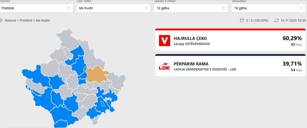 Kandidati i LDK-së për kryetar, Perparim Rama,  pas numërimit 100% të votave të personave me nevoja të veçanta ka marrë 108 vota, derisa ai i LVV-së, Hajrulla Çeku ka marrë 68.