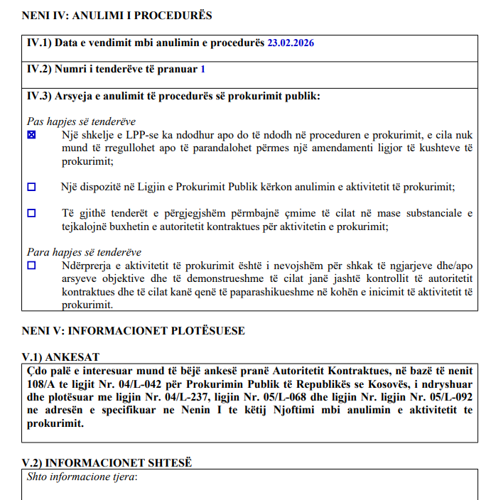 Anulimi ka ndodhur pas hapjes së ofertave, ndërsa si arsye është theksuar se ka pasur një shkelje të Ligjit të Prokurimit Publik, e cila nuk mund të rregullohej apo parandalohej përmes ndryshimit të kushteve të tenderit.
