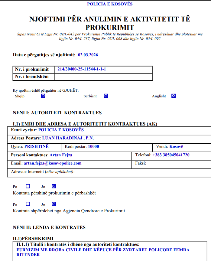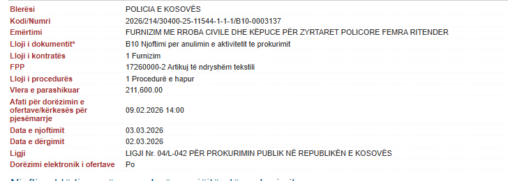 Policia e Kosovës ka anuluar një procedurë të ritenderit për furnizimin me rroba civile dhe këpucë për zyrtaret policore femra, me një vlerë të parashikuar prej 211,600 euro.