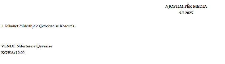 AktualeQeveria në detyrë mban sot mbledhje Posted on 09/07/2025 by Botapress.info Sot nga ora 10:00 do të mbahet mbledhja e Qeverisë në detyrë të Kosovës. Kështu thuhet në njoftimin e ZKM’së.