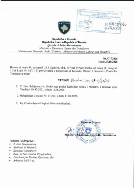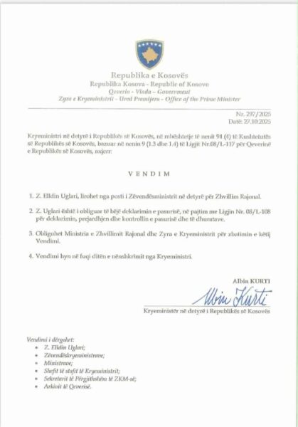Me vendim të nënshkruar nga kryeministri në detyrë, Albin Kurti, më datë 27 tetor 2025, është liruar nga detyra zëvendësministri për Zhvillim Rajonal, Elldin Ugllar, anëtar i partisë SDU, që udhëhiqet nga deputetja Duda Balje.