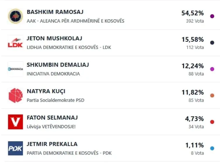 Në Deçan prin kryetari aktual Bashkim Ramosaj nga AAK-ja me 54.52 për qind, Jeton Mushkolaj nga LDK ka 15.58 për qind, Shkumbin Demaliaj, Iniciativa Demokracia 12.24, Natyra Kuçi PSD 11.82, Faton Selmanaj Lëvizja Vetëvendosje 4.73 për qind dhe Jetmir Prekalla PDK 1.11 për qind.