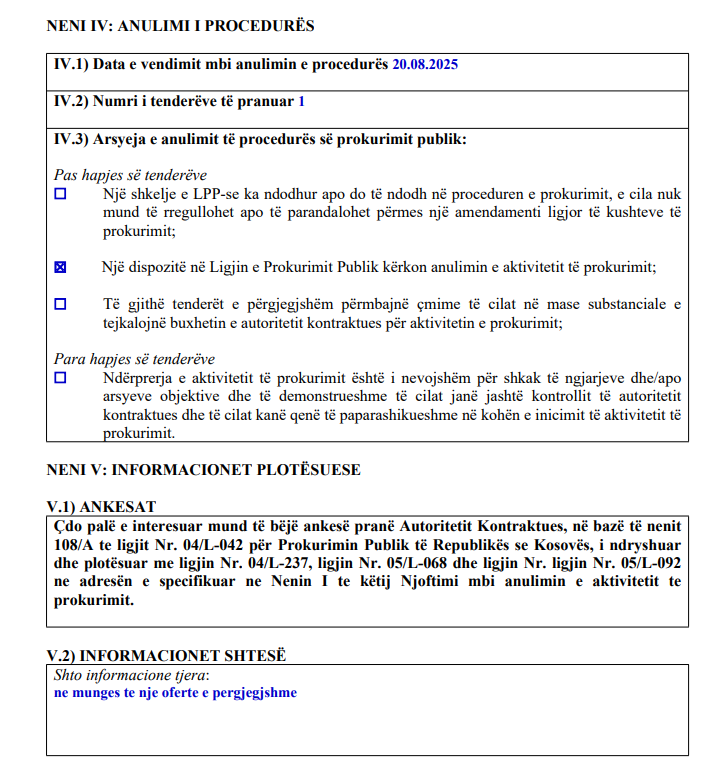 Pavarësisht interesimit të vetëm një operatori ekonomik, autoriteti kontraktues ka vendosur ta anulojë tenderin, duke u thirrur në mungesën e një oferte që i plotësonte kriteret e kërkuara.