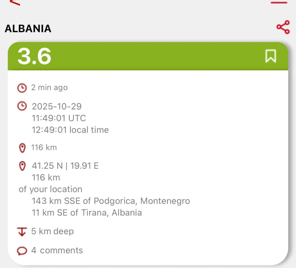 Tërmeti ndodhi rreth orës 12:49, afro 11 kilometra në juglindje të Tiranës, raporton IndeksOnline.