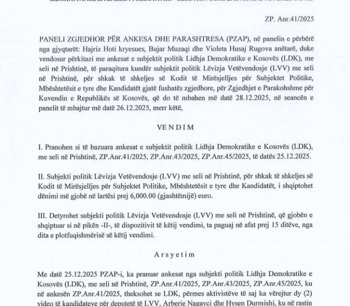 Lëvizja Vetëvendosje është dënuar me 6 mijë euro nga PZAP pas ankesës së Lidhjes Demokratike të Kosovës.